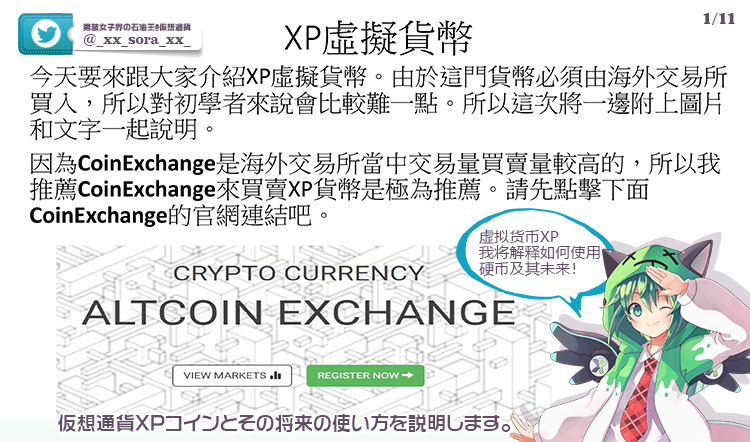 今天要來跟大家介紹XP虛擬貨幣。由於這門貨幣必須由海外交易所 買入,所以對初學者來說會比較難一點。所以這次將一邊附上圖片 和文字一起說明。